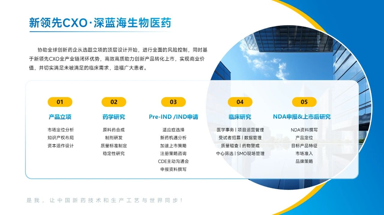 深藍(lán)海生物醫(yī)藥是新領(lǐng)先醫(yī)藥(股票代碼600222 )在臨床 CRO 領(lǐng)域的子品牌,成立于 2007 年,秉持“以終為始,頂層設(shè)計(jì),做新藥創(chuàng)制的全程合作伙伴"的服務(wù)理念,為全球藥企提供覆蓋生物藥、化藥、中藥、醫(yī)療器械、細(xì)胞與基因治療等I-III期臨床研究、生物等效性研究、上市后研究、第三方稽查、IND和NDA申報以及醫(yī)學(xué)事務(wù)等服務(wù)??蓾M足不同研發(fā)型企業(yè)的臨床研究定制需求,為國內(nèi)外客戶打通新藥上市前關(guān)鍵瓶頸。