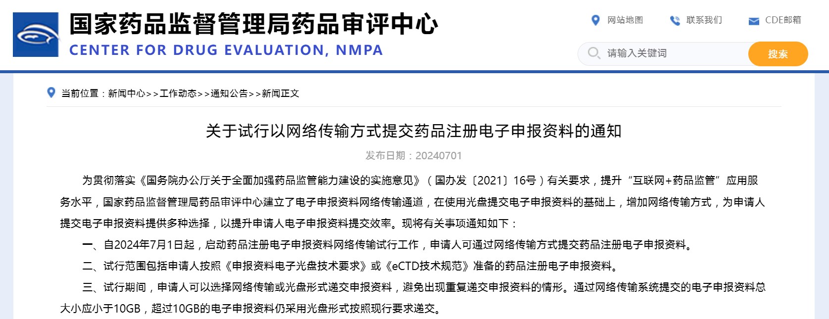 關于試行以網(wǎng)絡傳輸方式提交藥品注冊電子申報資料的通知