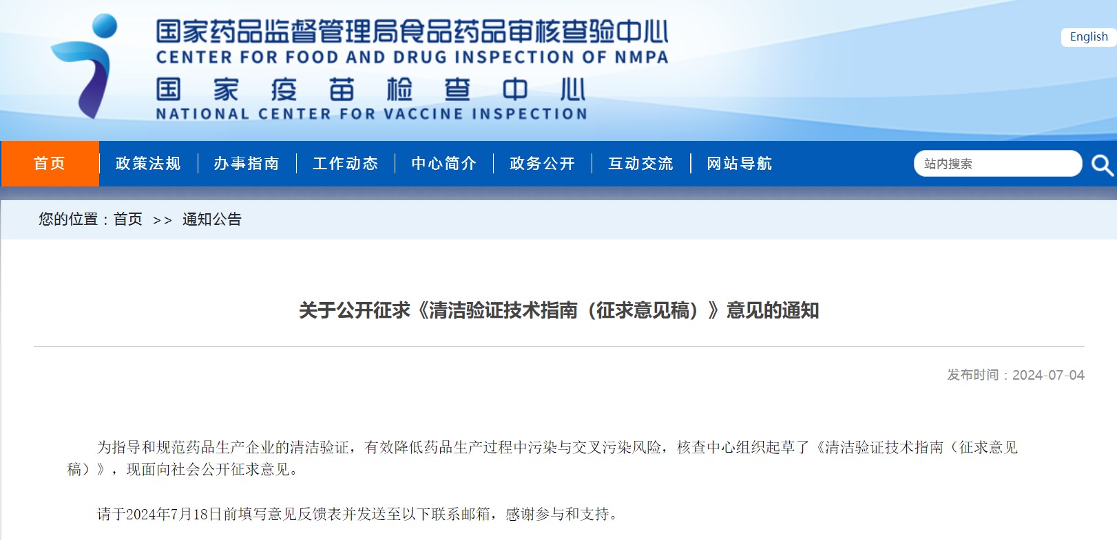 關于公開征求《清潔驗證技術指南(征求意見稿)》意見的通知