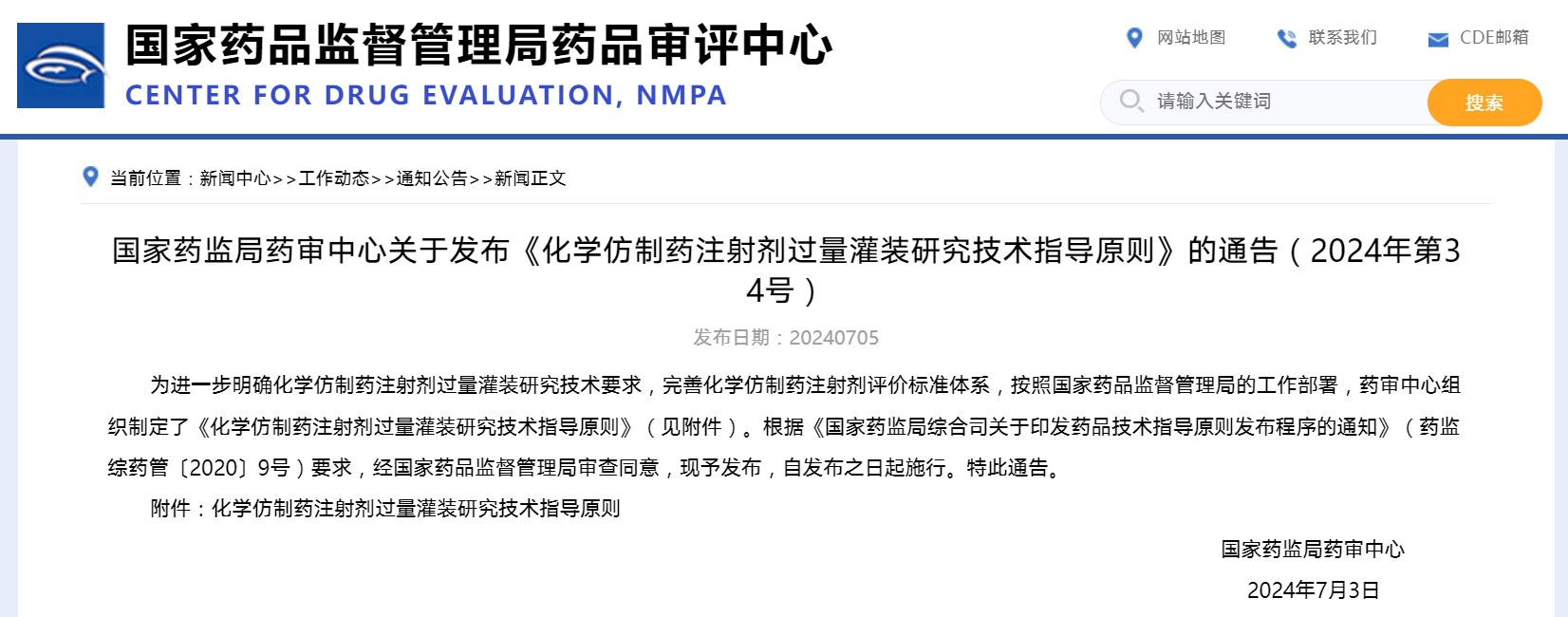 國家藥監(jiān)局藥審中心關于發(fā)布《化學仿制藥注射劑過量灌裝研究技術指導原則》的通告(2024年第34號)