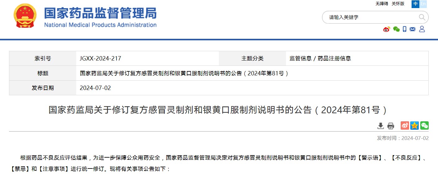 國家藥監(jiān)局關于修訂復方感冒靈制劑和銀黃口服制劑說明書的公告(2024年第81號)