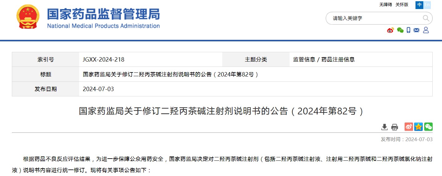國家藥監(jiān)局關于修訂二羥丙茶堿注射劑說明書的公告(2024年第82號)