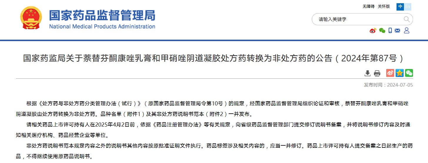 國家藥監(jiān)局關于萘替芬酮康唑乳膏和甲硝唑陰道凝膠處方藥轉(zhuǎn)換為非處方藥的公告(2024年第87號)