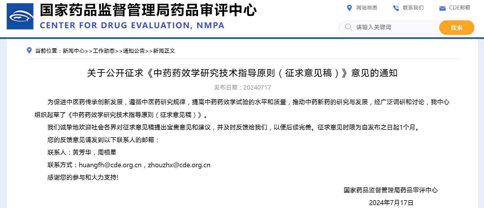 關于公開征求《中藥藥效學研究技術指導原則(征求意見稿)》意見的通知