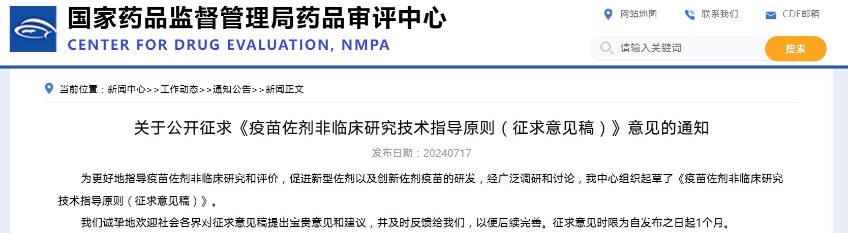 關于公開征求《疫苗佐劑非臨床研究技術指導原則(征求意見稿)》意見的通知