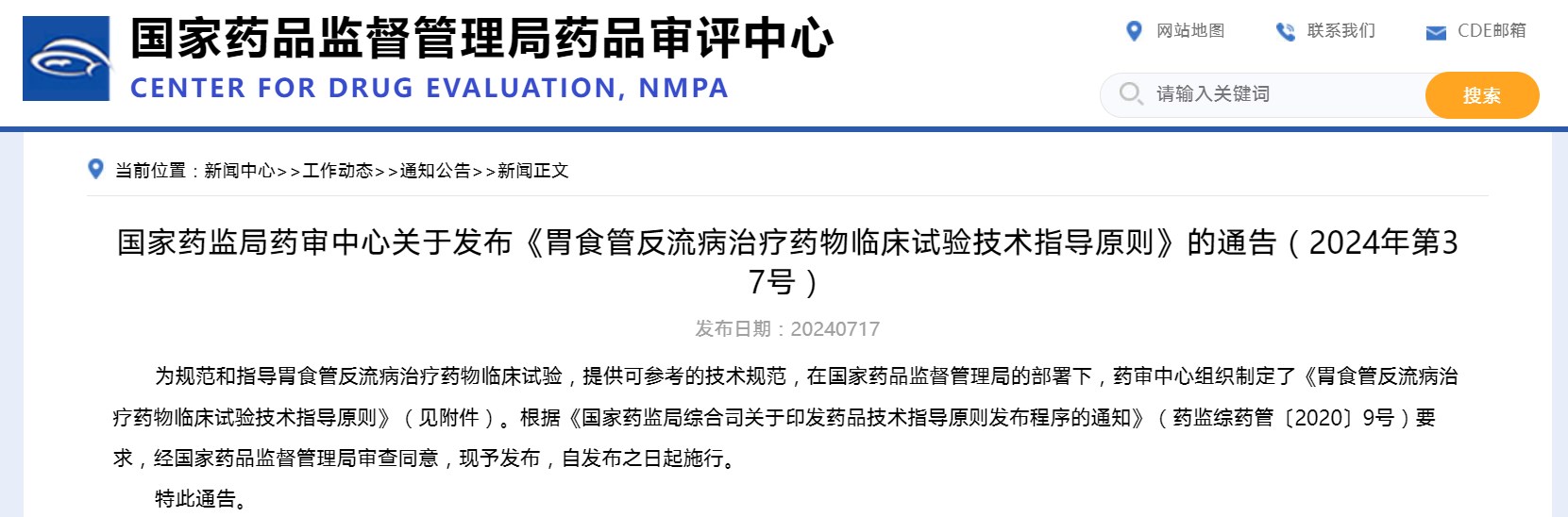 國家藥監(jiān)局藥審中心關于發(fā)布《胃食管反流病治療藥物臨床試驗技術指導原則》的通告(2024年第37號)