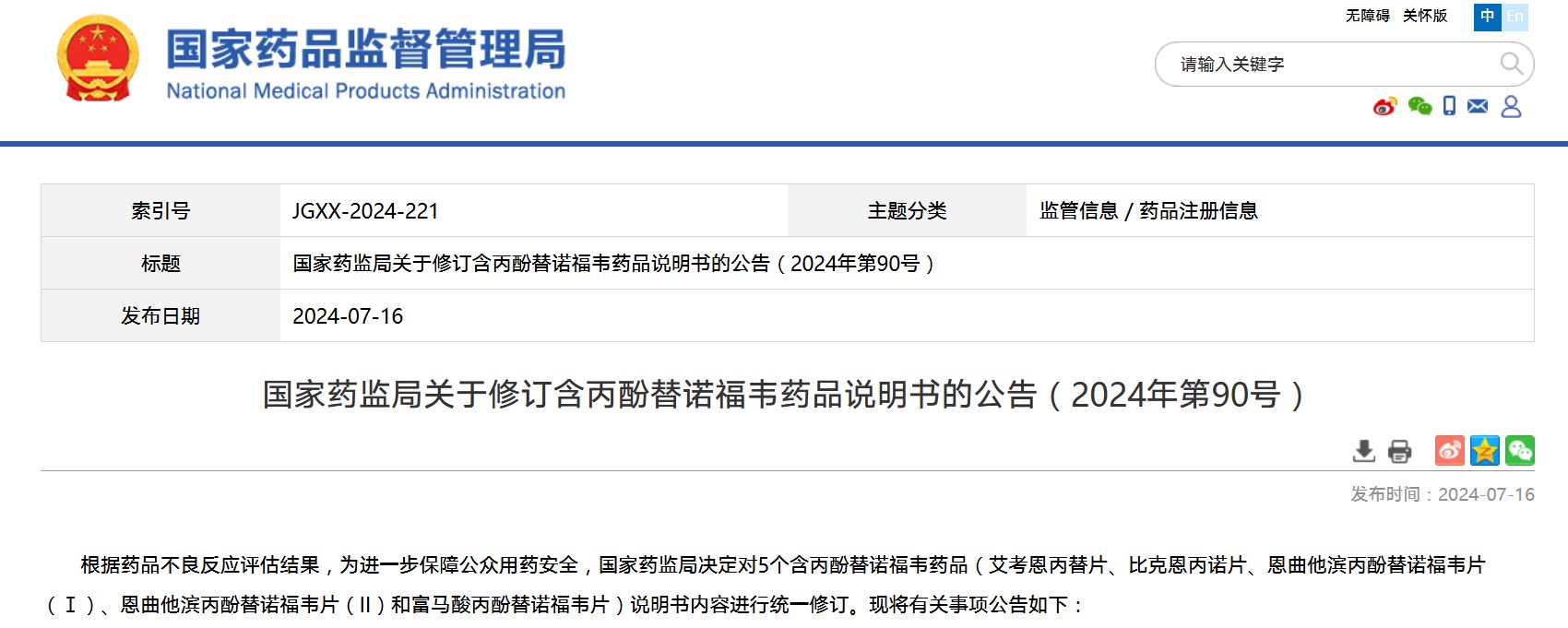 國家藥監(jiān)局關于修訂含丙酚替諾福韋藥品說明書的公告(2024年第90號)