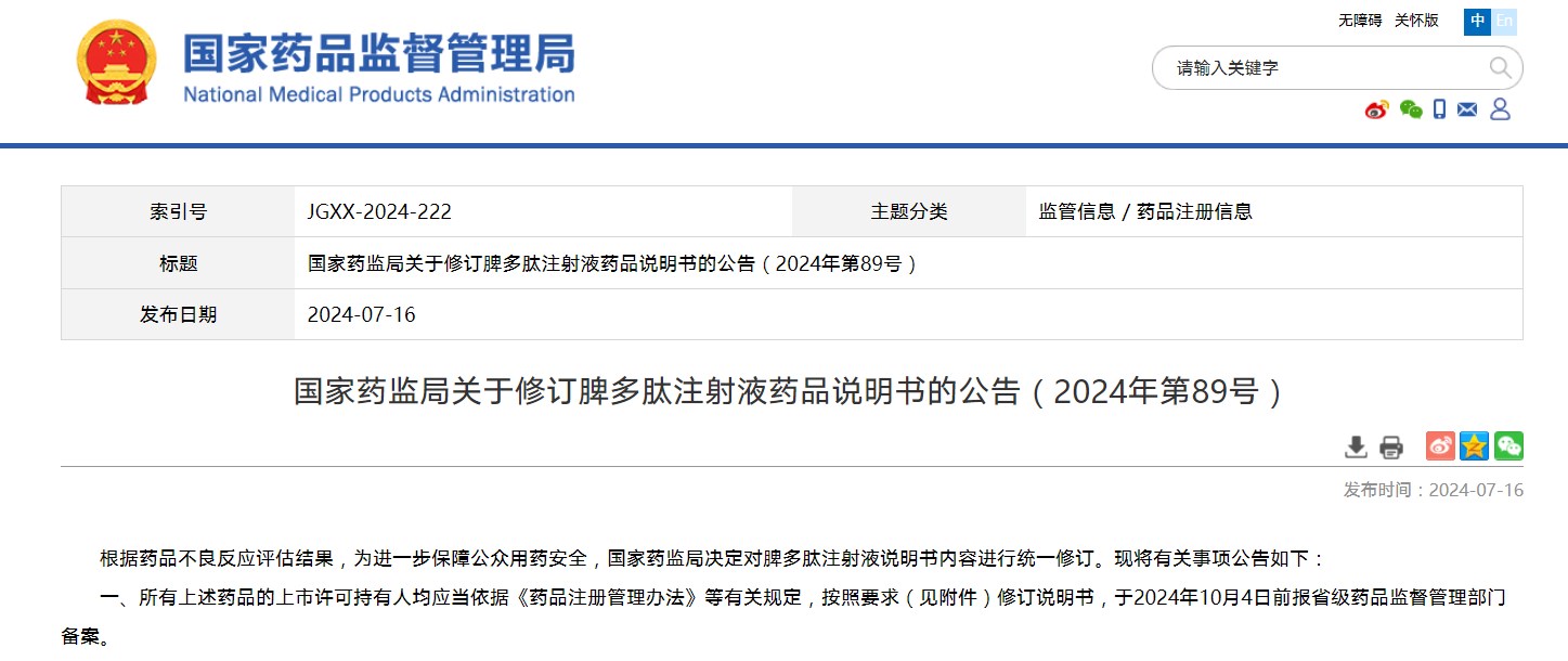 國家藥監(jiān)局關于修訂脾多肽注射液藥品說明書的公告(2024年第89號)