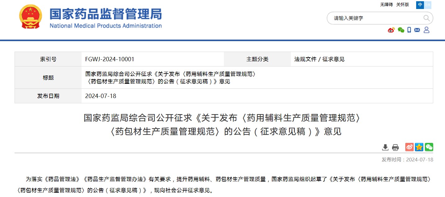 國家藥監(jiān)局綜合司公開征求《關于發(fā)布〈藥用輔料生產質量管理規(guī)范〉〈藥包材生產質量管理規(guī)范〉的公告(征求意見稿)》意見
