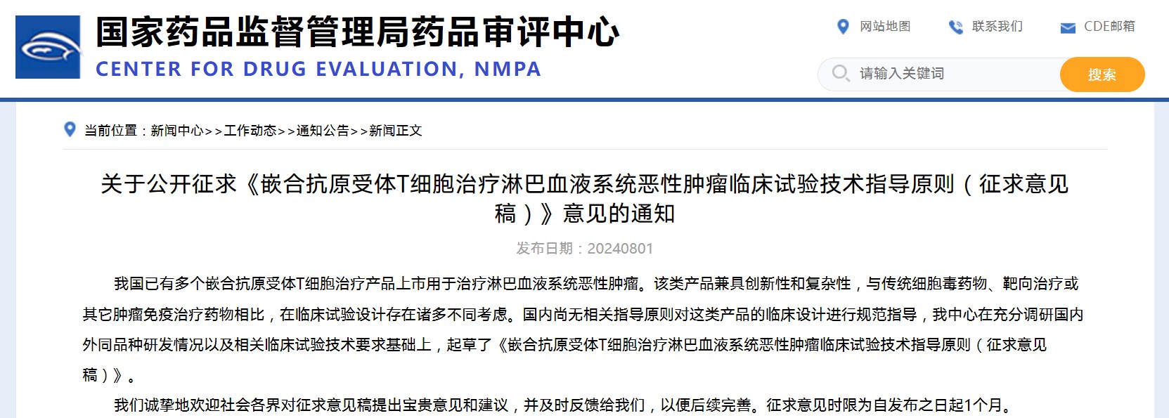 關(guān)于公開征求《嵌合抗原受體T細胞治療淋巴血液系統(tǒng)惡性腫瘤臨床試驗技術(shù)指導(dǎo)原則(征求意見稿)》意見的通知