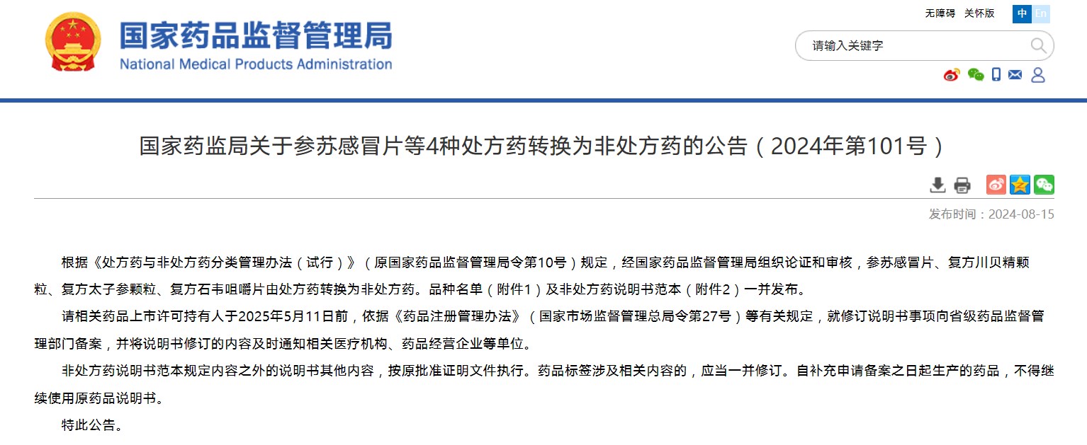 國家藥監(jiān)局關于參蘇感冒片等4種處方藥轉換為非處方藥的公告(2024年第101號)