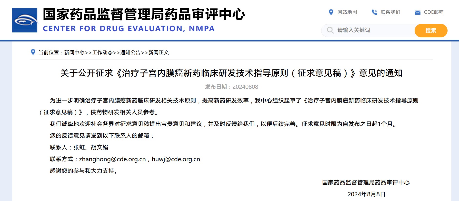 關于公開征求《治療子宮內膜癌新藥臨床研發(fā)技術指導原則(征求意見稿)》意見的通知