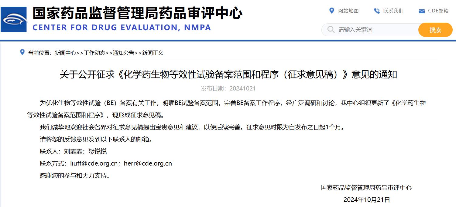 關(guān)于公開(kāi)征求《化學(xué)藥生物等效性試驗(yàn)備案范圍和程序(征求意見(jiàn)稿)》意見(jiàn)的通知
