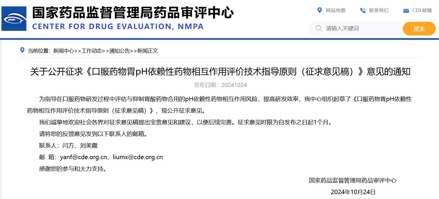 關(guān)于公開(kāi)征求《口服藥物胃pH依賴性藥物相互作用評(píng)價(jià)技術(shù)指導(dǎo)原則(征求意見(jiàn)稿)》意見(jiàn)的通知國(guó)家藥監(jiān)局