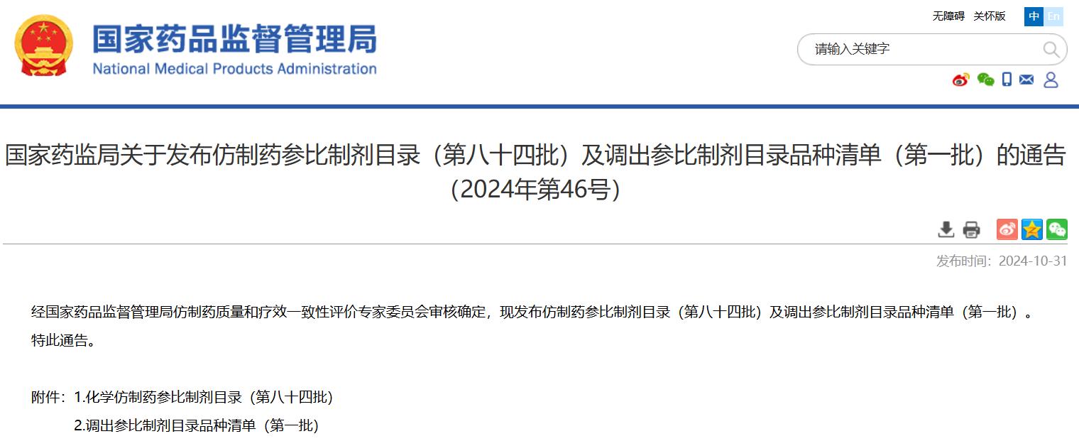 關(guān)于發(fā)布仿制藥參比制劑目錄(第八十四批)及調(diào)出參比制劑目錄品種清單(第一批)的通告(2024年第46號(hào))