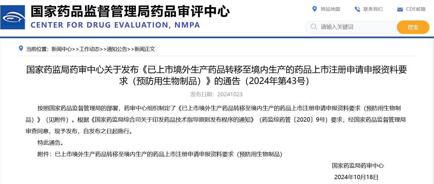 國(guó)家藥監(jiān)局藥審中心關(guān)于發(fā)布《已上市境外生產(chǎn)藥品轉(zhuǎn)移至境內(nèi)生產(chǎn)的藥品上市注冊(cè)申請(qǐng)申報(bào)資料要求(預(yù)防用生物制品)》的通告(2024年第43號(hào))