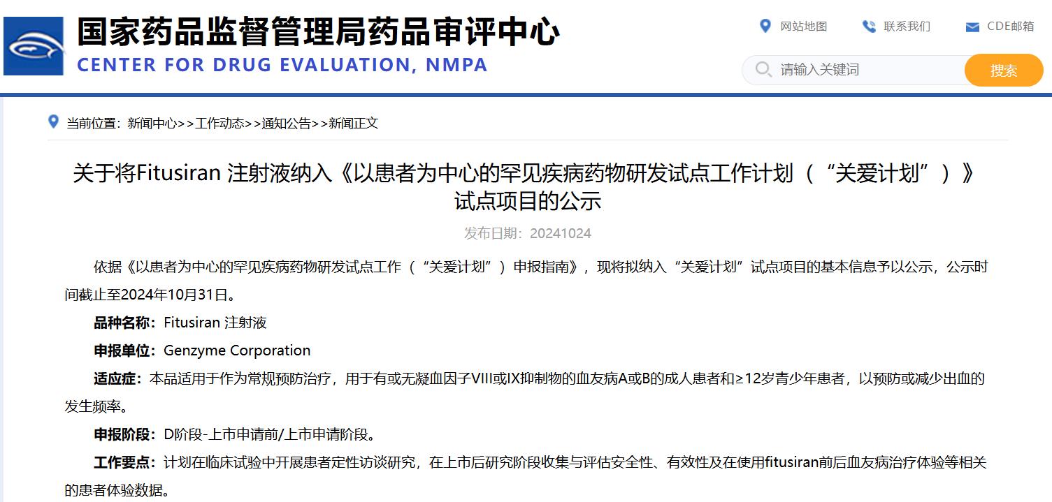 關(guān)于將Fitusiran 注射液納入《以患者為中心的罕見(jiàn)疾病藥物研發(fā)試點(diǎn)工作計(jì)劃(“關(guān)愛(ài)計(jì)劃”)》試點(diǎn)項(xiàng)目的公示