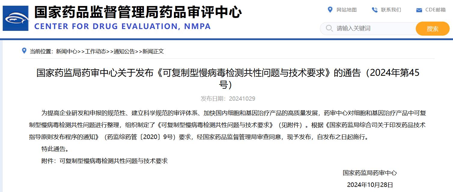國(guó)家藥監(jiān)局藥審中心關(guān)于發(fā)布《可復(fù)制型慢病毒檢測(cè)共性問(wèn)題與技術(shù)要求》的通告(2024年第45號(hào))