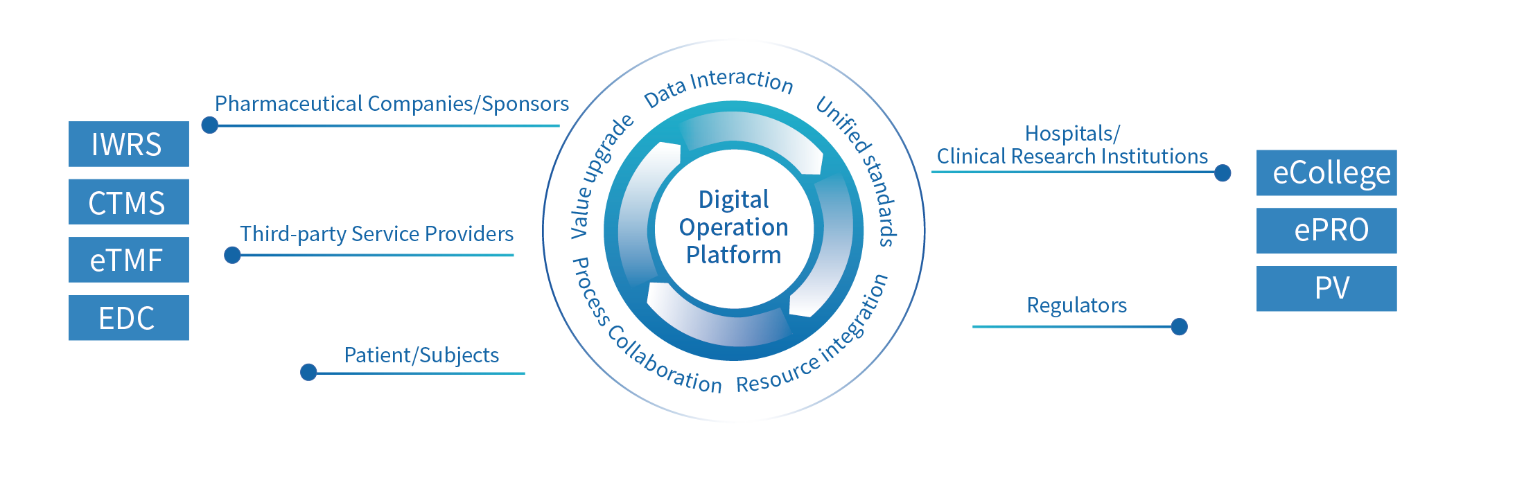 The Digital Operation Platform has realized all-round digital driven. By leveraging professional digital software, collaboration platforms, and professional service capabilities, the platform connects industry participants such as hospitals, pharmaceutical companies, service providers, regulatory agencies, and patients to achieve comprehensive data-driven approaches in all aspects. We are also committed to promoting the development of clinical research through innovative service models and multi-dimensional information technology.